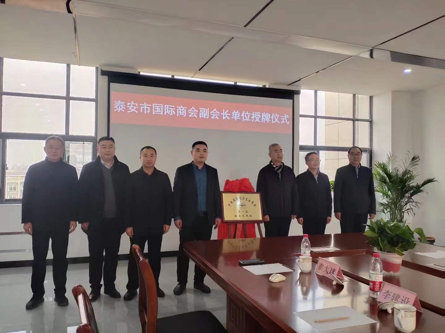 2022年1月6日下午,泰安市貿(mào)促會(huì)黨組書記、會(huì)長(zhǎng)陳勇,市貿(mào)促會(huì)黨組成員、副會(huì)長(zhǎng)張桂明,泰安市國(guó)際商會(huì)秘書長(zhǎng)趙傳兵,泰安市會(huì)展副總經(jīng)理胡闊偉,泰山區(qū)委副書記、區(qū)政府代區(qū)長(zhǎng)周鵬飛,區(qū)委常委、區(qū)政府黨組副書記朱光勝,區(qū)政府黨組成員、區(qū)政府辦公室主任孫一國(guó),區(qū)政府黨組成員、區(qū)政府辦公室副主任孫大偉,區(qū)貿(mào)促會(huì)黨組書記李建設(shè),區(qū)貿(mào)促會(huì)會(huì)長(zhǎng)湯琳琳,省莊鎮(zhèn)黨委書記謝慧清,省莊鎮(zhèn)鎮(zhèn)長(zhǎng)季秀華等相關(guān)領(lǐng)導(dǎo)蒞臨泰安德美新廠區(qū)舉行隆重的授牌儀式,為泰安德美機(jī)電設(shè)備有限公司董事長(zhǎng)秦大斌先生授牌,泰安德美機(jī)電設(shè)備有限公司榮升為泰安市國(guó)際商會(huì)副會(huì)長(zhǎng)單位!