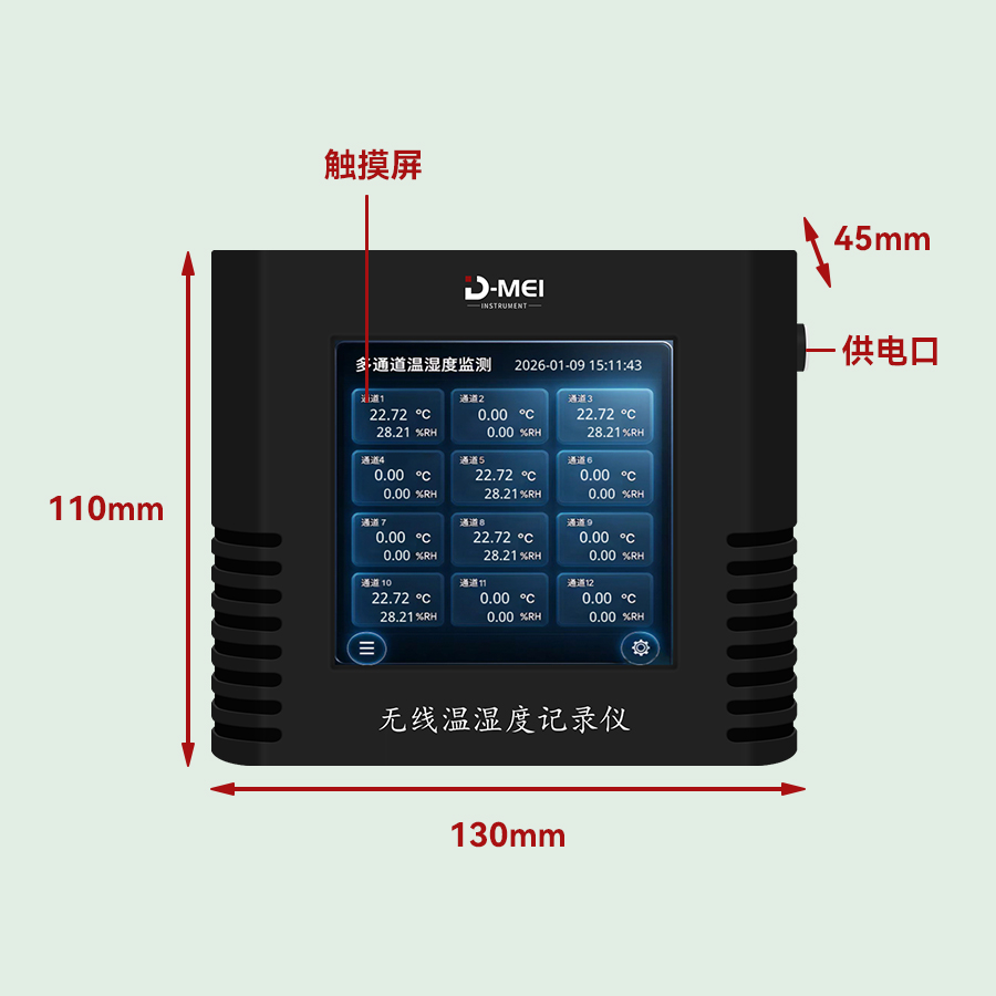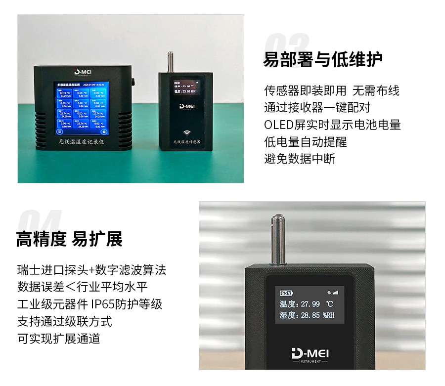 無線溫濕度采集系統(tǒng)是一款高精度、多通道、易部署的環(huán)境監(jiān)測解決方案,由無線溫濕度傳感器和無線接收器兩部分組成。系統(tǒng)采用瑞士Sensirion原裝溫濕度探頭,結(jié)合2.4G無線通信技術(shù)與工業(yè)級顯示模塊,支持多只傳感器同步監(jiān)測,適用于實驗室、倉儲、農(nóng)業(yè)大棚、機房等多場景的溫濕度實時監(jiān)控與數(shù)據(jù)追溯。