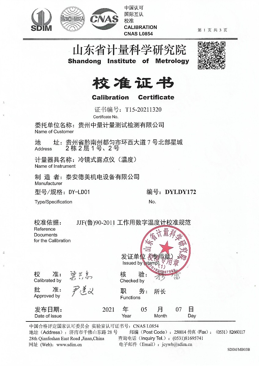 | 上一條:貴州中量計(jì)量測(cè)試檢測(cè)有限公司-冷鏡式露點(diǎn)儀檢定證書(shū) | 下一條:便攜式干體爐(-30-150℃)校準(zhǔn)證書(shū) |