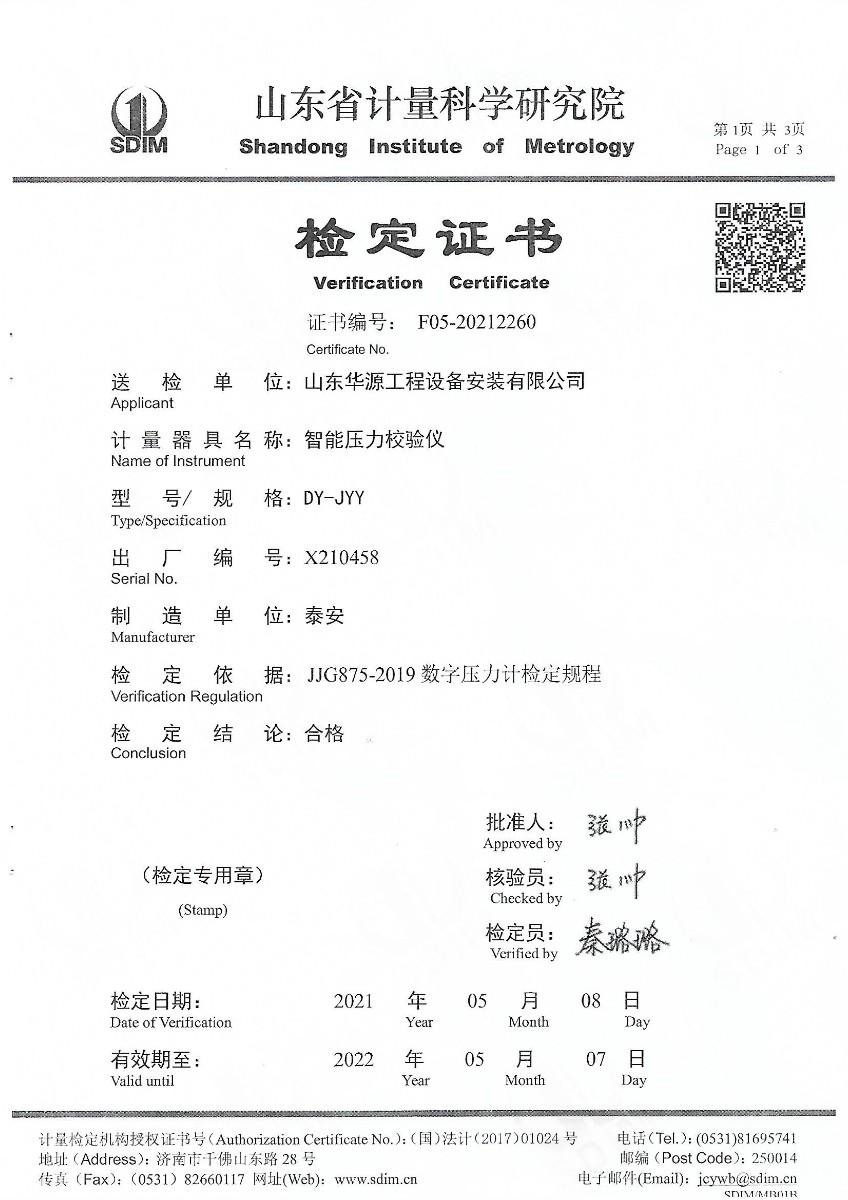 | 上一條:山東華源工程設(shè)備安裝有限公司-智能壓力校驗(yàn)儀X210457 | 下一條:便攜式干體爐(-30-150℃)校準(zhǔn)證書(shū) |