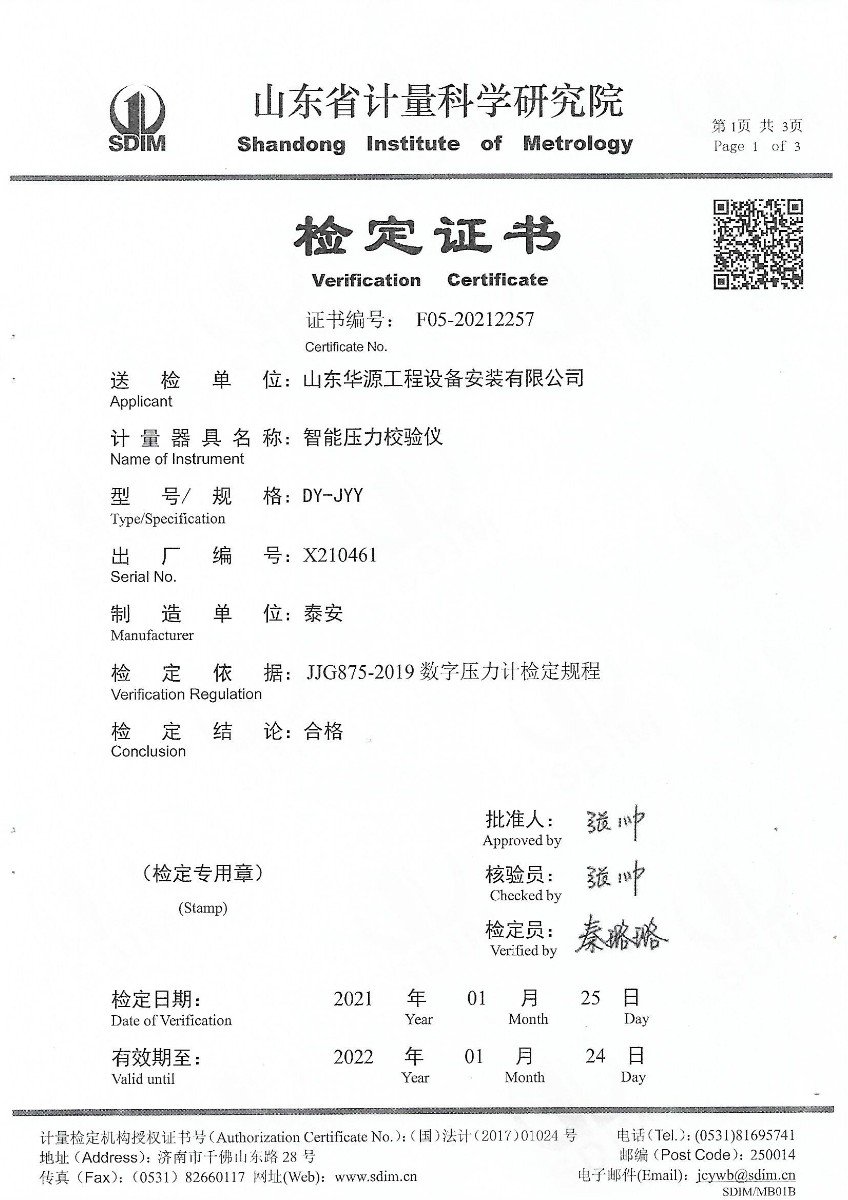 | 上一條:山東華源工程設(shè)備安裝有限公司-智能壓力校驗(yàn)儀X210460 | 下一條:便攜式干體爐(-30-150℃)校準(zhǔn)證書 |