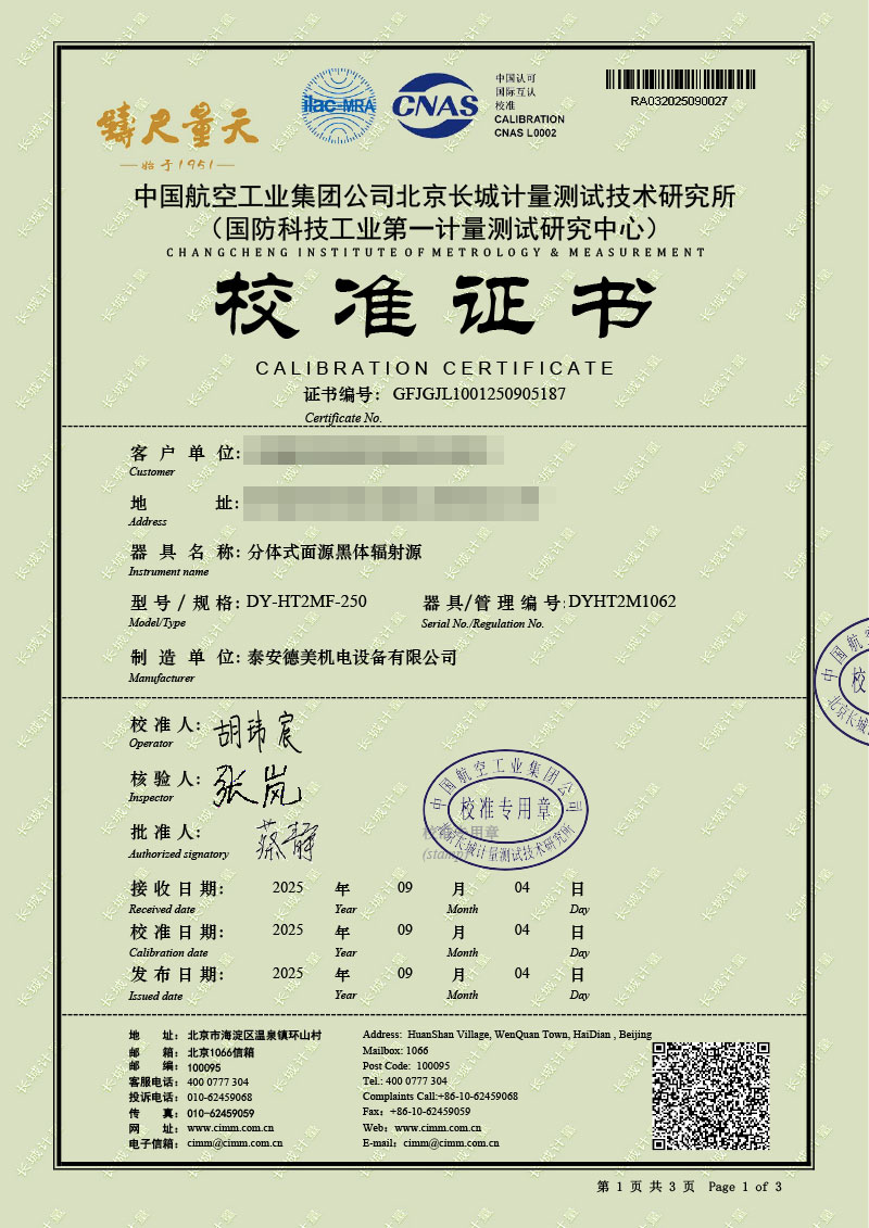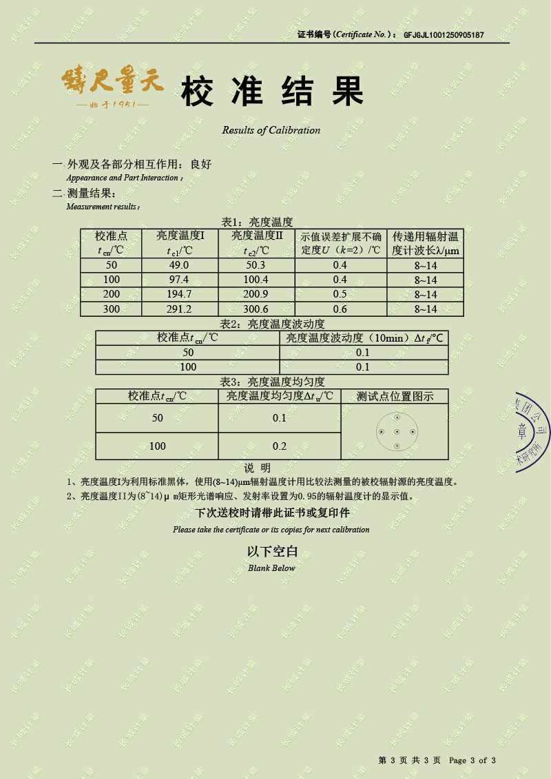 分體式面源黑體輻射源(室溫+5-300℃)校準證書 2025-9-12 本文被閱讀 1235 次