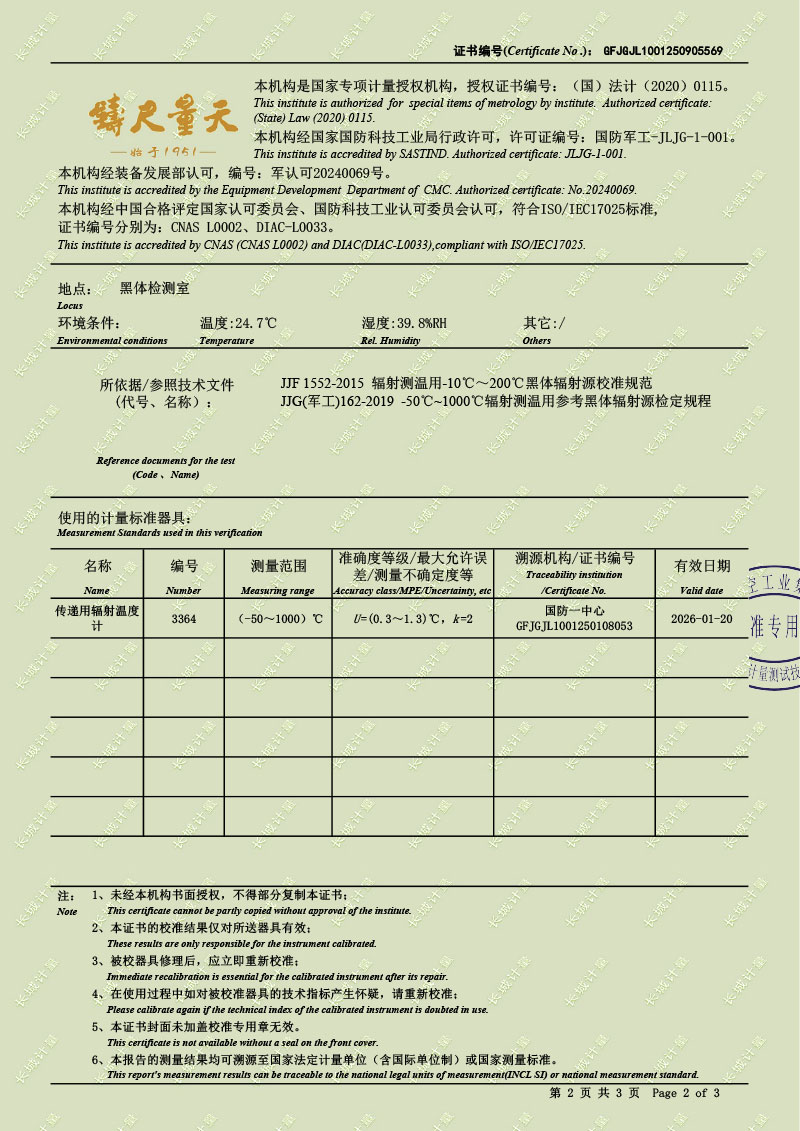 | 上一條:分體式面源黑體輻射源(室溫+5-300℃)校準(zhǔn)證書 | 下一條:便攜式干體爐(-30-150℃)校準(zhǔn)證書 |