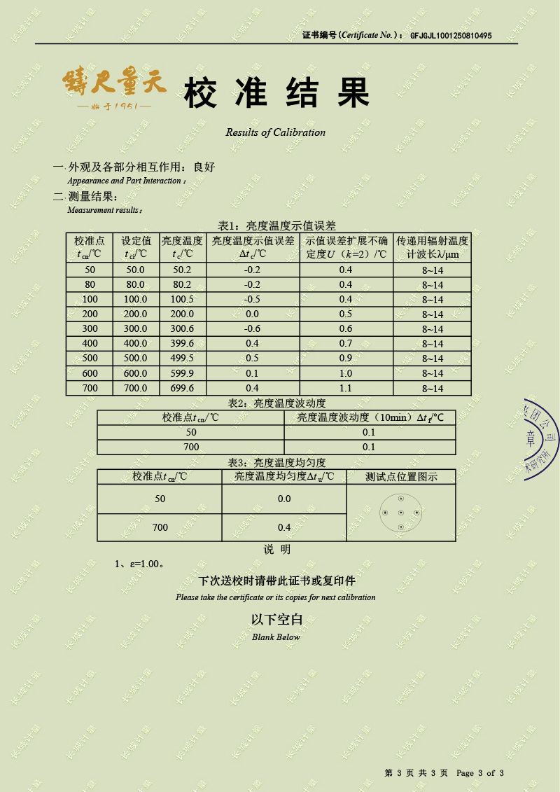 | 上一條:低溫浴式黑體輻射源(-55-80℃)校準(zhǔn)證書 | 下一條:超低溫面源黑體爐(-40-80℃)校準(zhǔn)證書 |