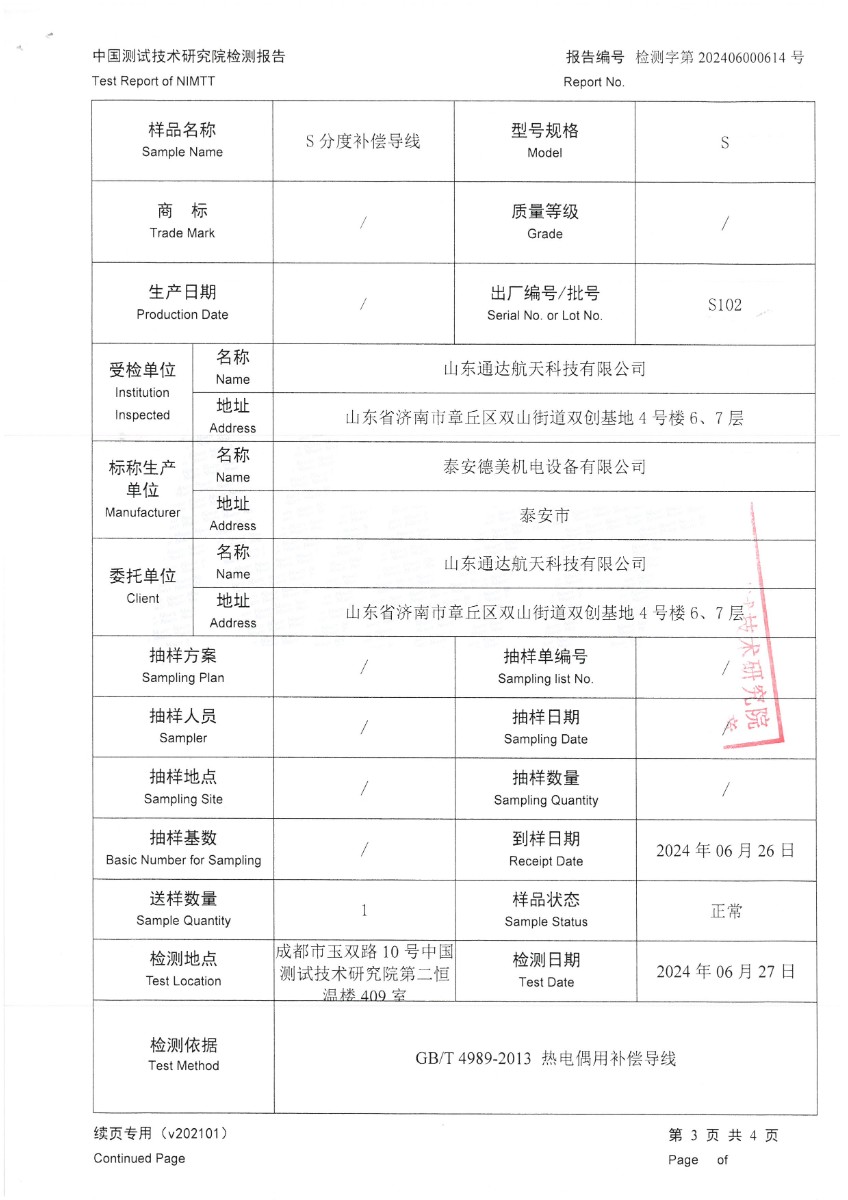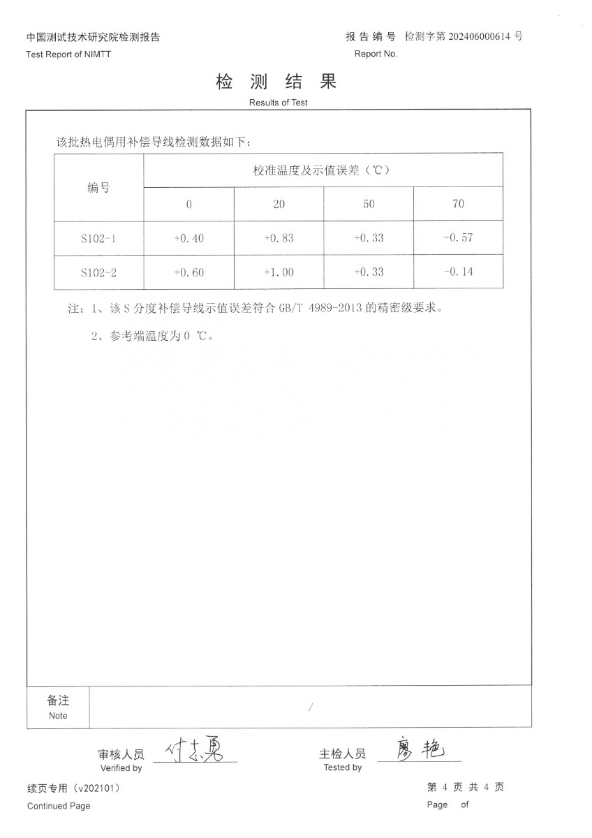 補償導(dǎo)線S分度檢測報告 2024-6-29 本文被閱讀 5825 次
