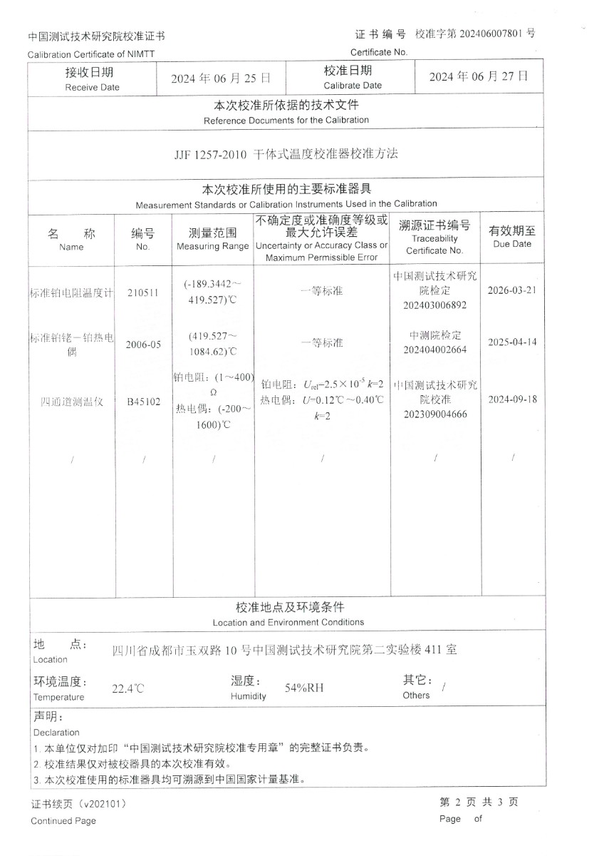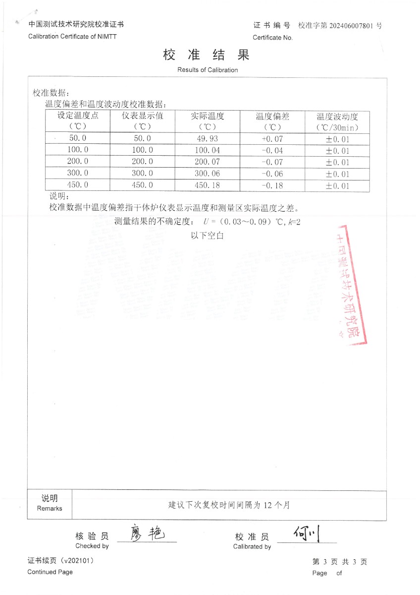 中溫干體爐(50~450℃)校準證書 2024-7-1 本文被閱讀 5955 次