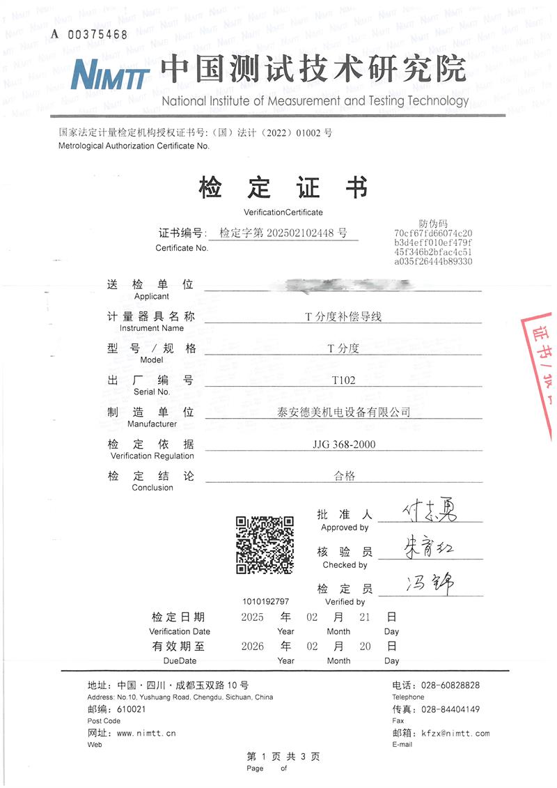 | 上一條:S分度補(bǔ)償導(dǎo)線檢測(cè)報(bào)告 | 下一條:超低溫面源黑體爐(-40-80℃)校準(zhǔn)證書 |