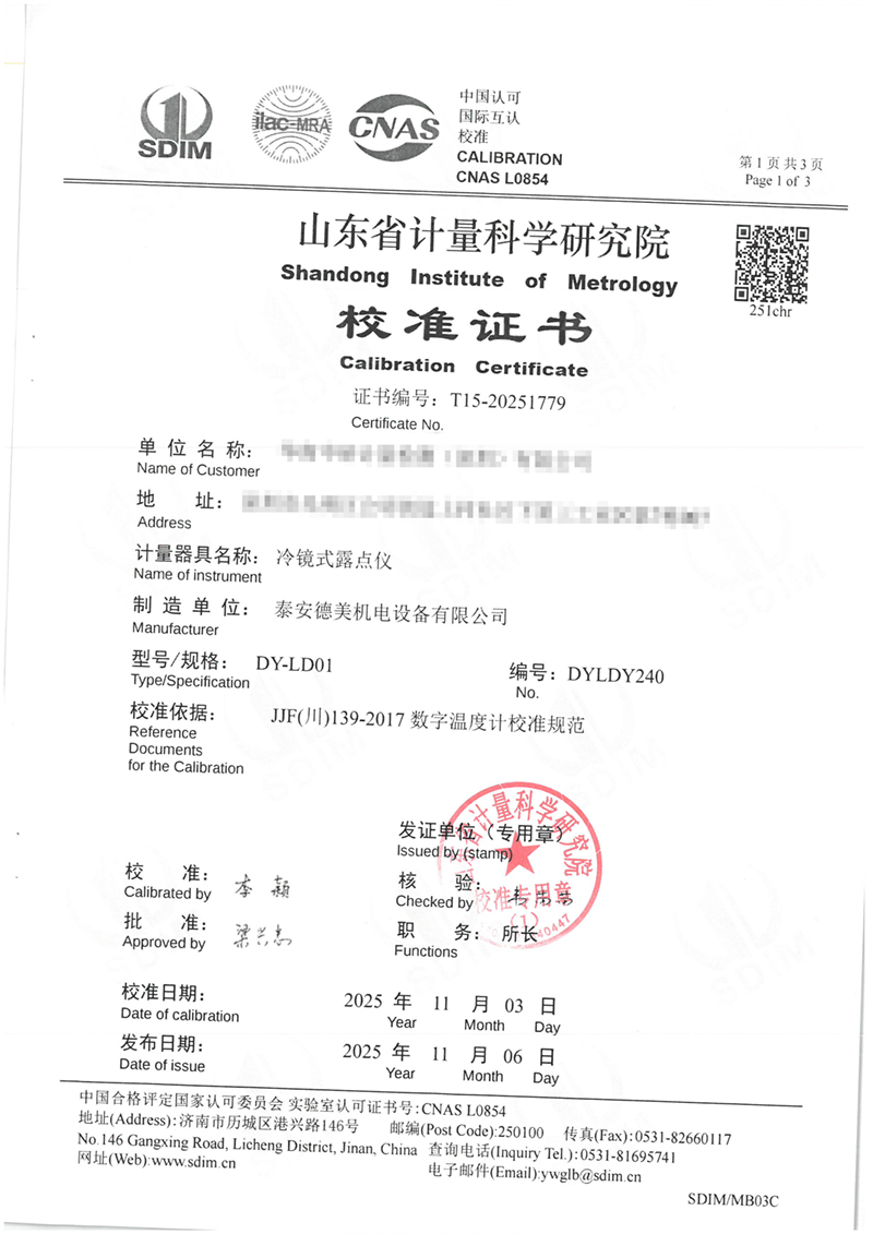 冷鏡式露點(diǎn)儀校準(zhǔn)證書 2025-11-7 本文被閱讀 978 次
