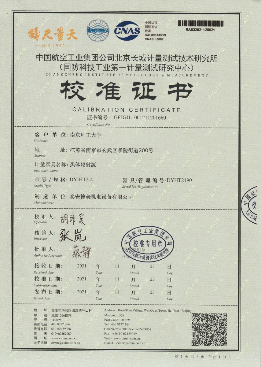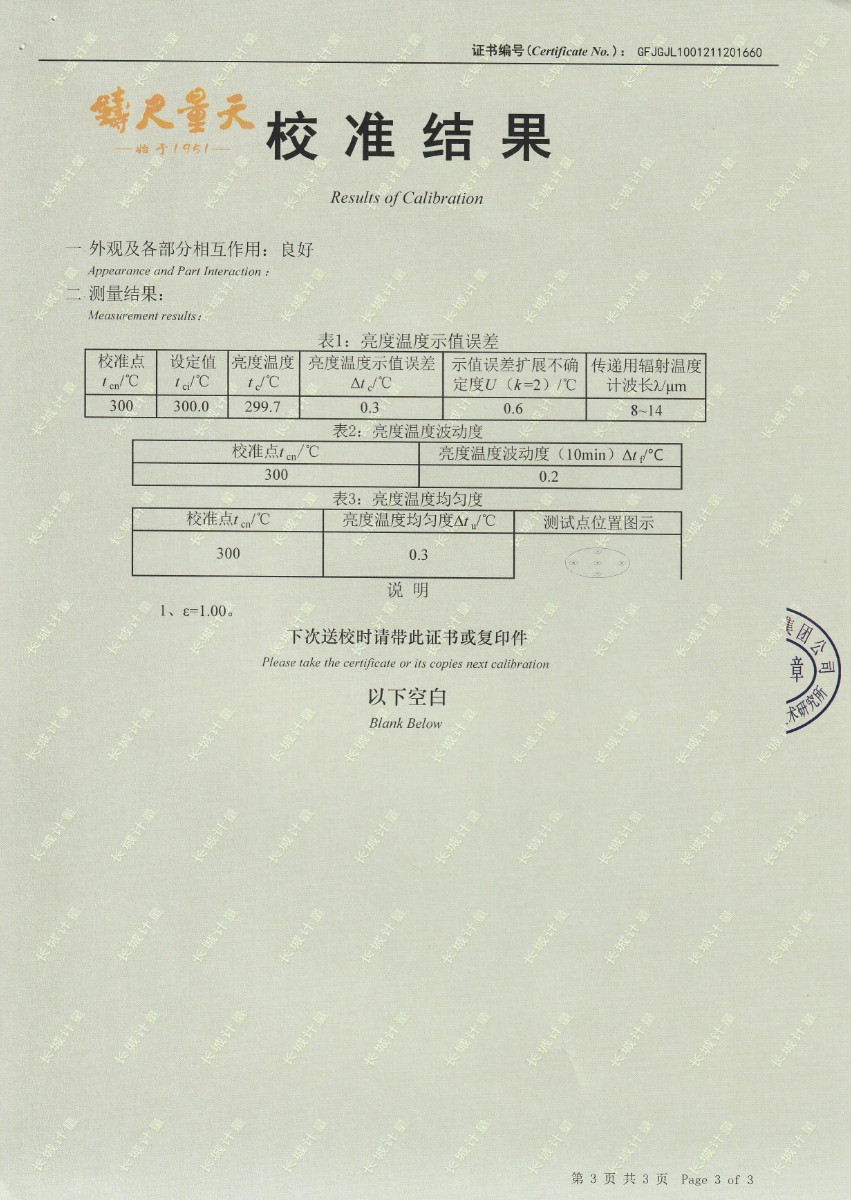 | 上一條:南京理工大學(xué)-黑體輻射源校準(zhǔn)證書180-500℃ | 下一條:便攜式干體爐(-30-150℃)校準(zhǔn)證書 |