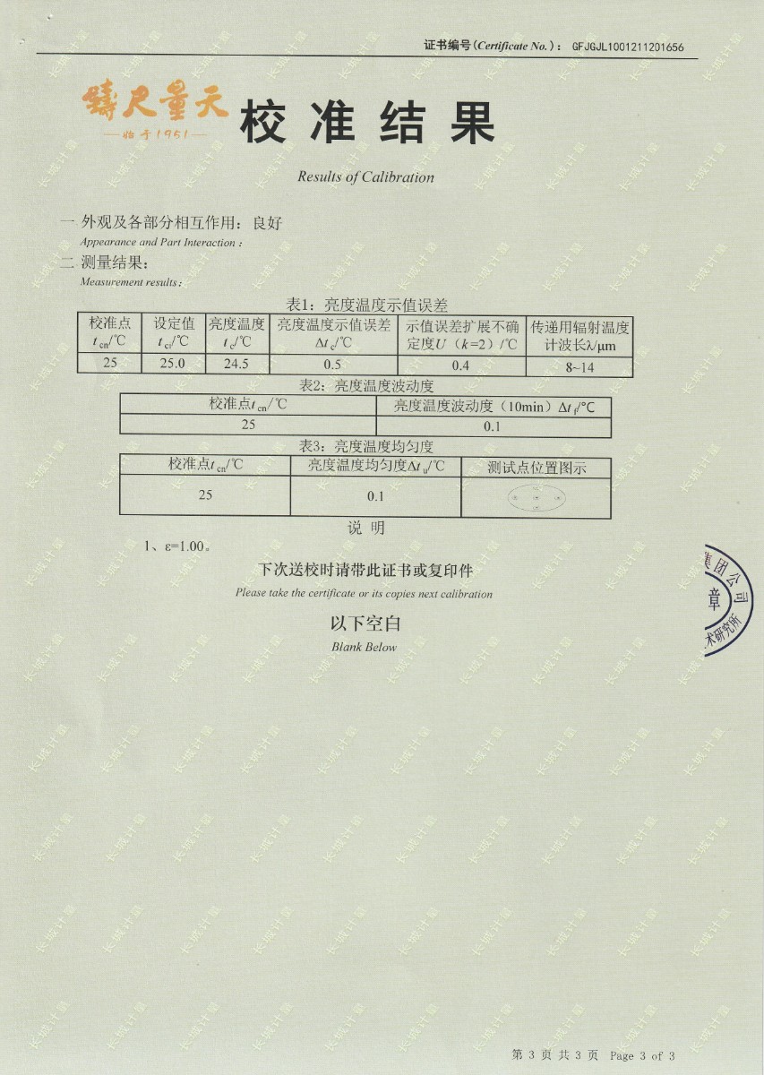| 上一條:南京理工大學(xué)-黑體輻射源校準(zhǔn)證書10-60℃ | 下一條:便攜式干體爐(-30-150℃)校準(zhǔn)證書 |