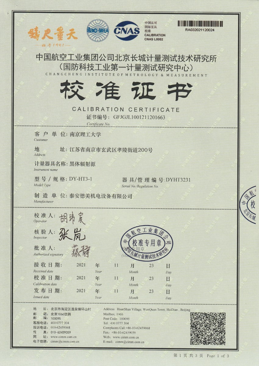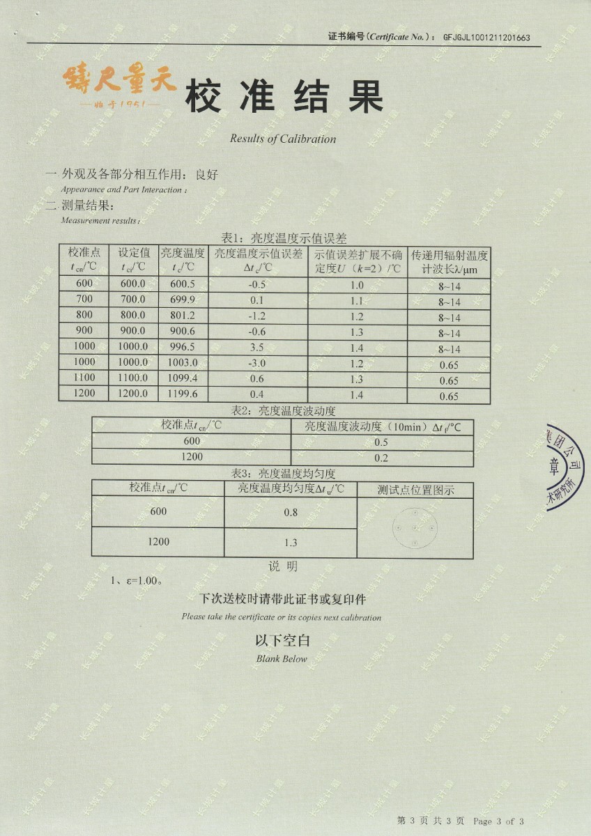 | 上一條:南京理工大學(xué)-黑體輻射源校準(zhǔn)證書350-800℃ | 下一條:便攜式干體爐(-30-150℃)校準(zhǔn)證書 |